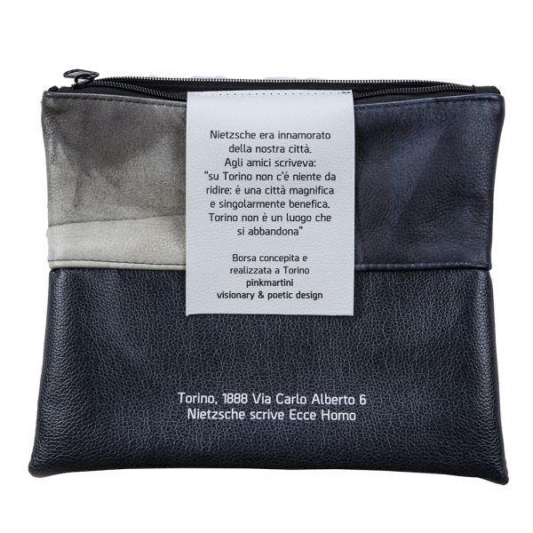 Borsa in ecopelle di vari colori e inserto in pelle dipinto a mano con tracolla regolabile e rimovibile... l’etichetta interna vi svelerà la storia. Chiusura a cerniera. Handmade in Torino.